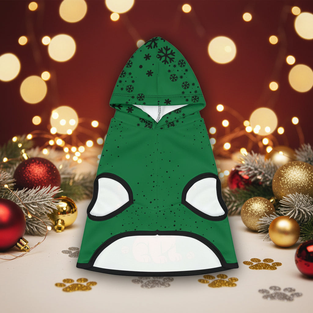 Bold “Merry Woofmas” text, cartoon fur baby, and jingle bell accents. Cozy green fleece with black rib cuffs makes this hoodie pop in every holiday photo.